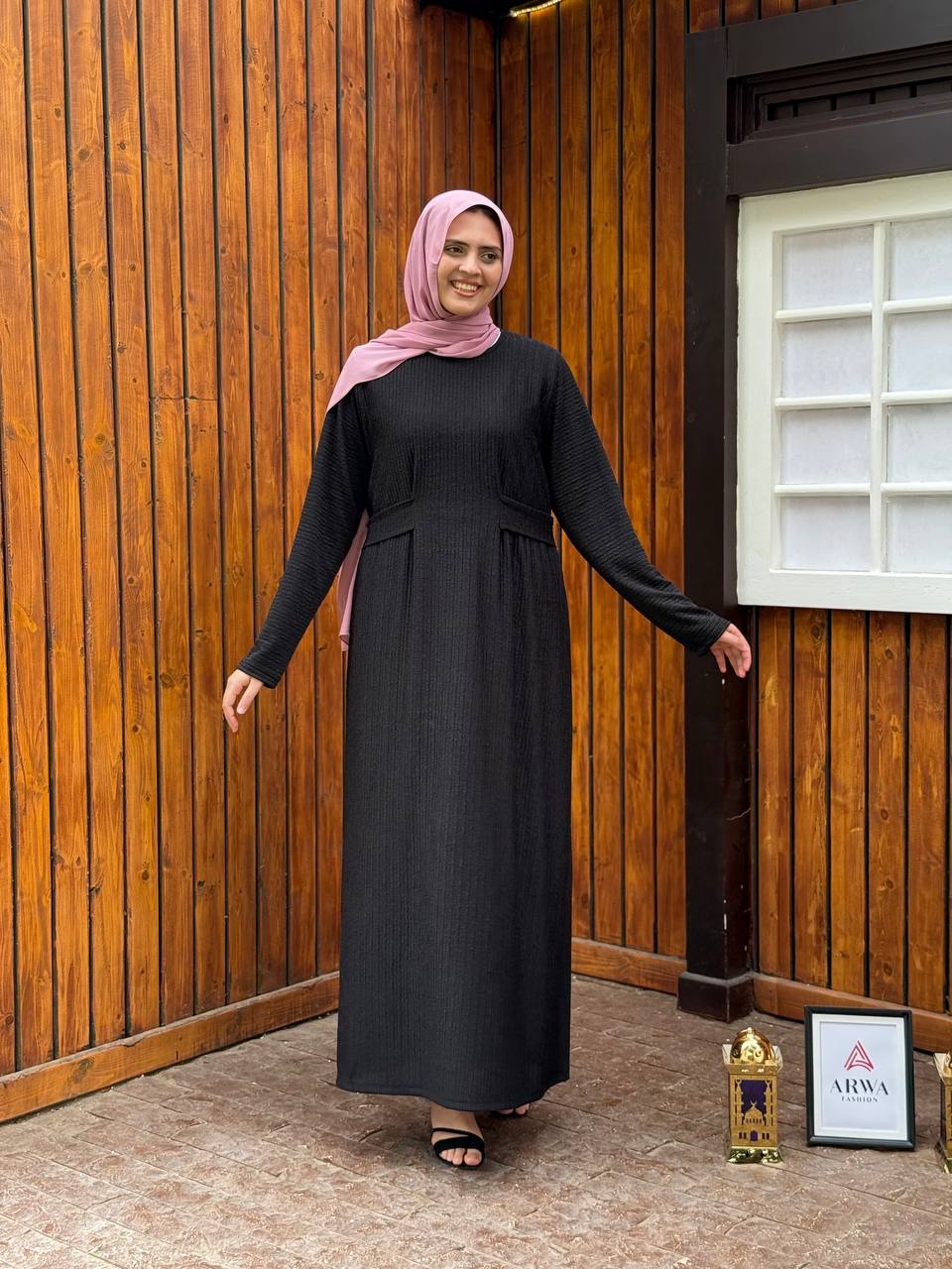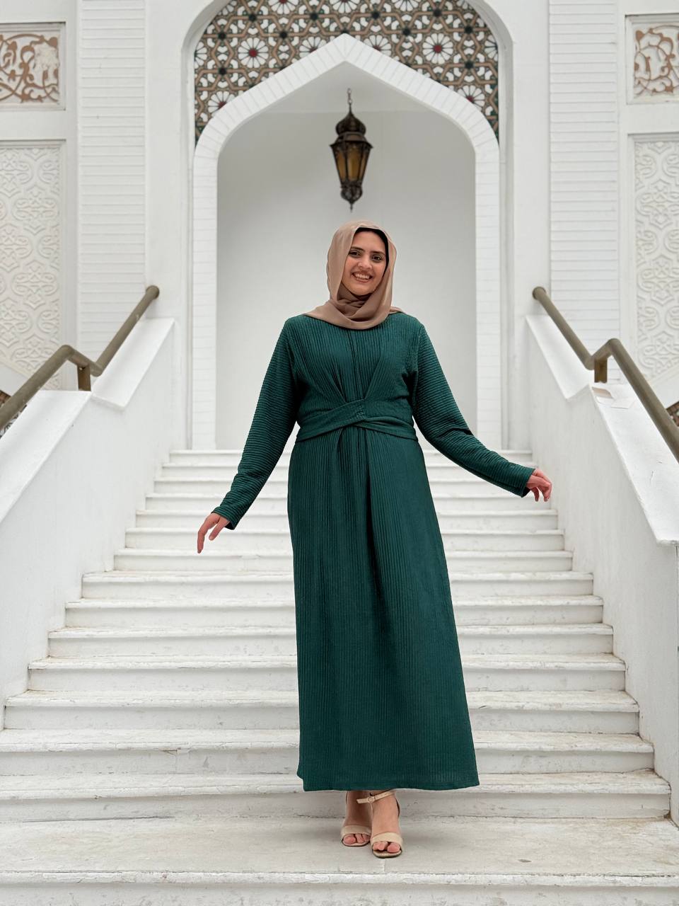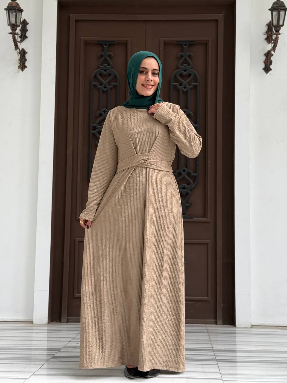 - وصف المنتج: فستان بيزك بكم مزود بحزام متصل عن الخصر.