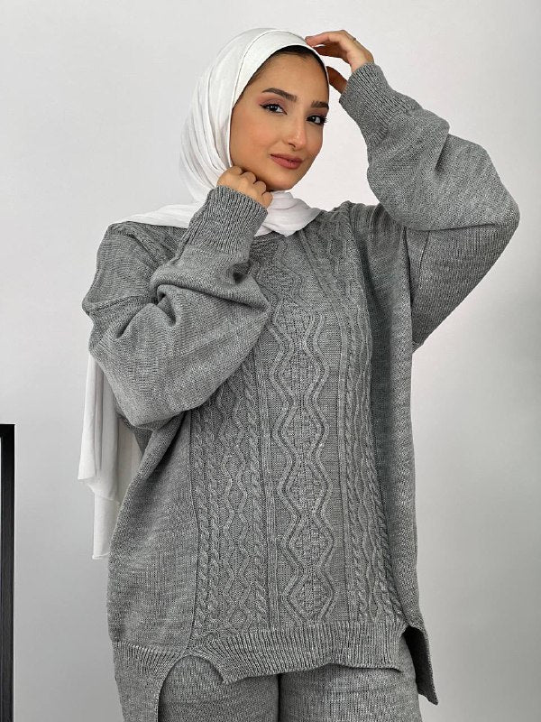 - وصف المنتج: طقم مكون من بنطللون وبلوفر تريكو عليه ضفائر من الأمام